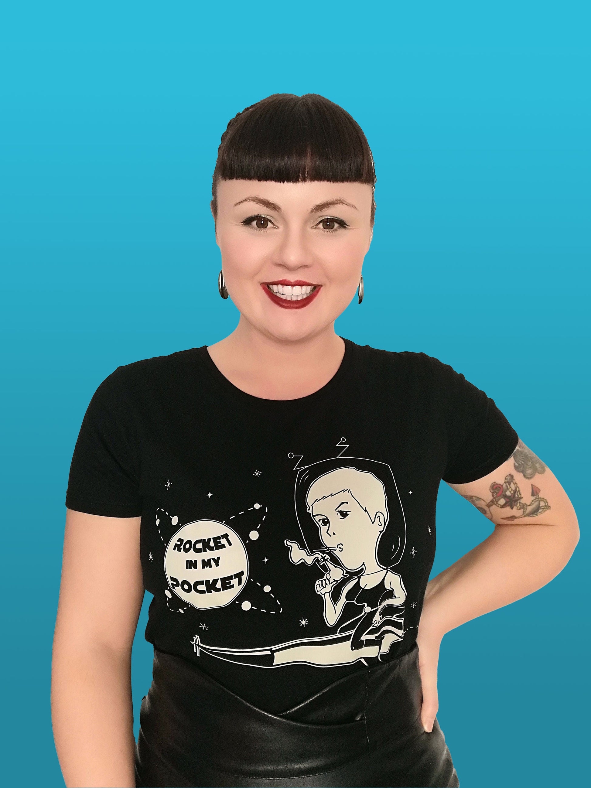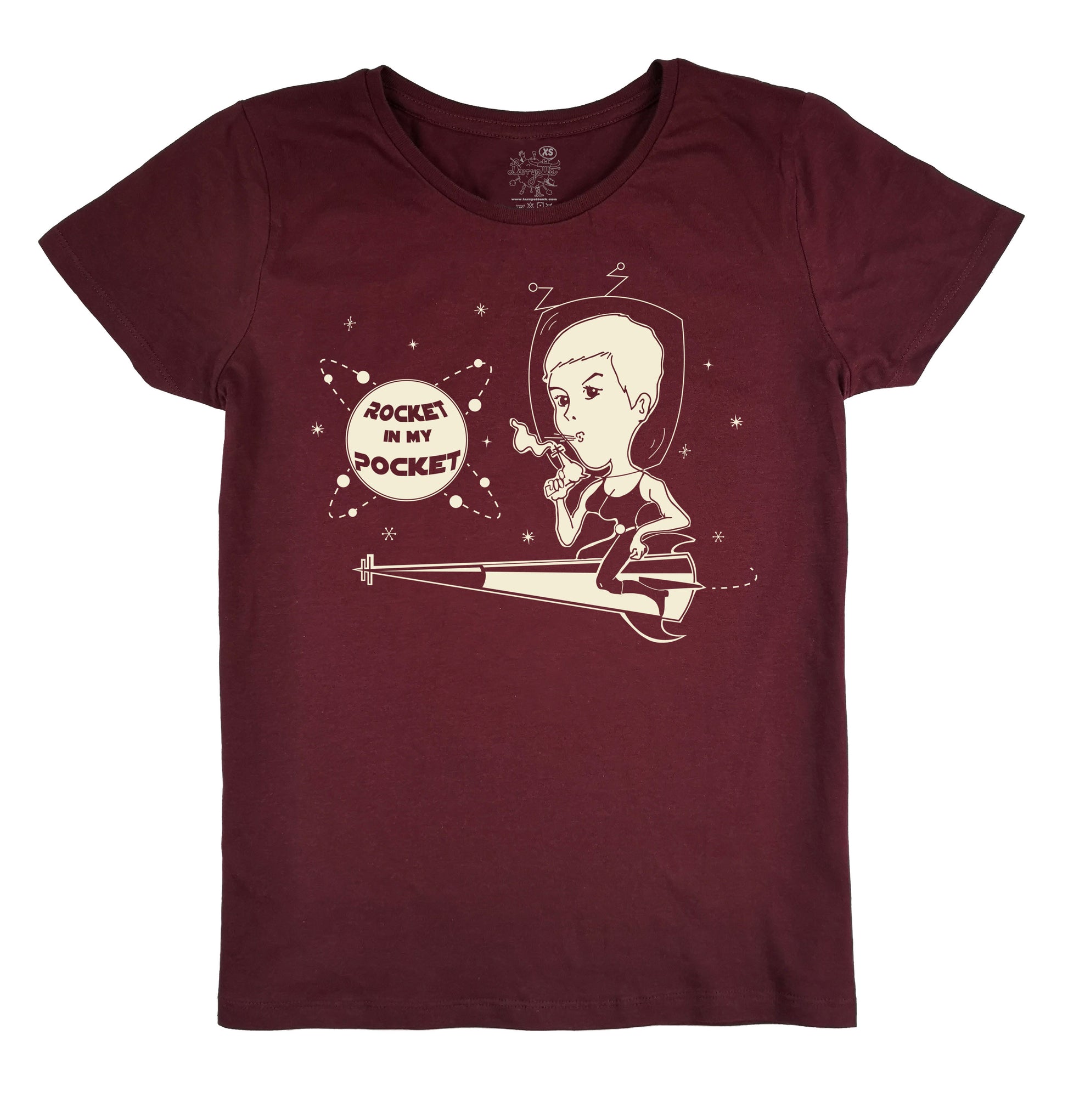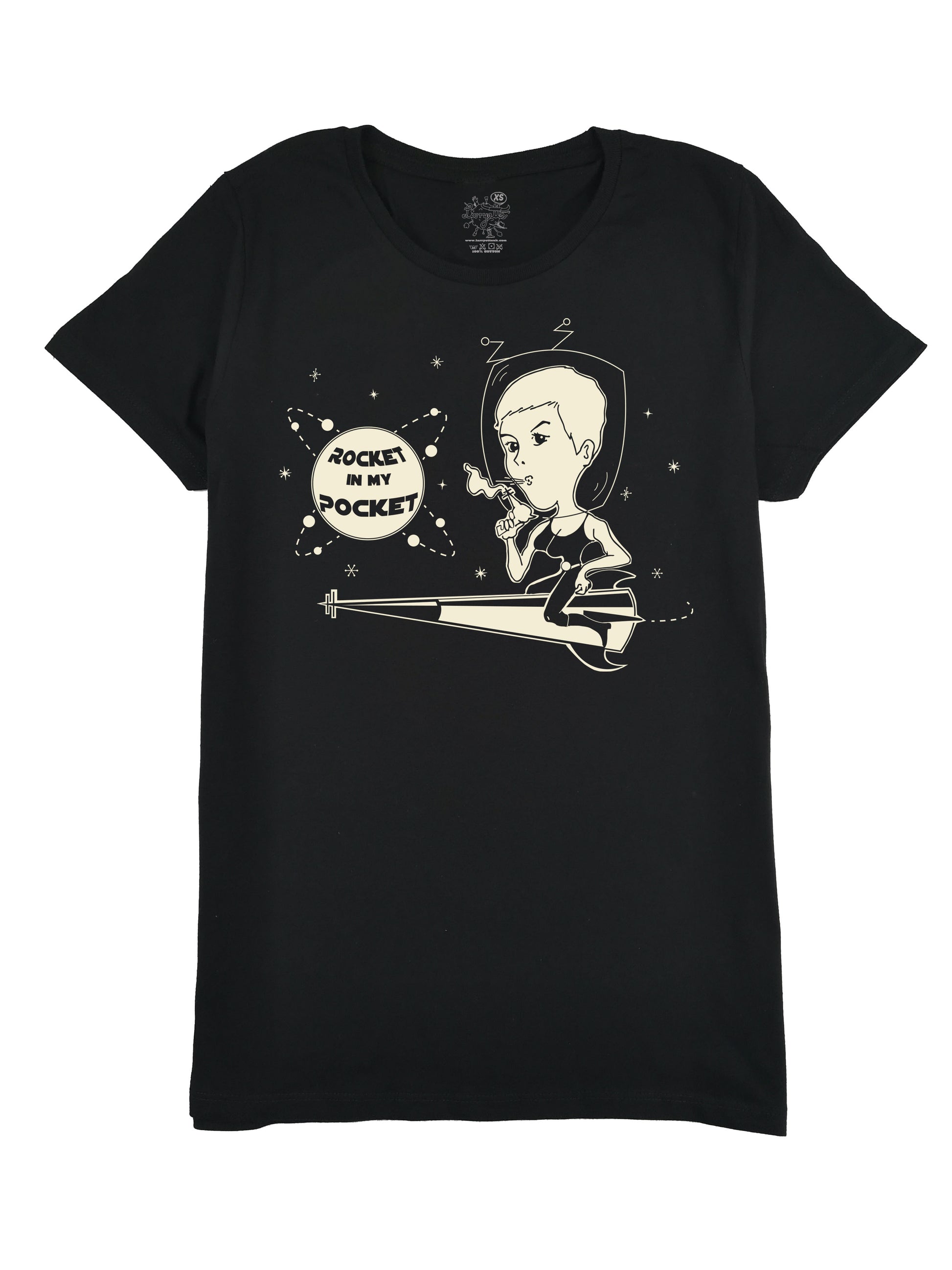 Houston, we have a problem! A saucy space age garment is about to launch! Complete with galactic pinup with raygun, our pocket rocket design is screen printed onto 100% black cotton.