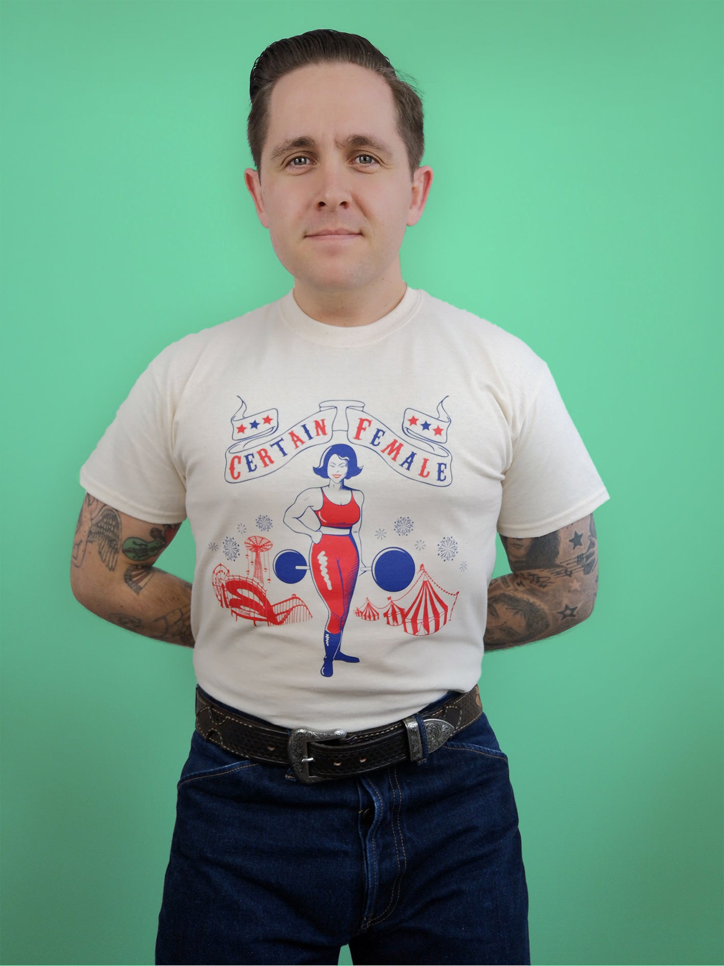 Hurry! Hurry! Step right up! See the certain female you’ve all been waiting for! Complete with fairground and big tops, our sideshow strong woman design is screen printed onto 100% natural cotton, giving it that authentic 50’s look and feel.